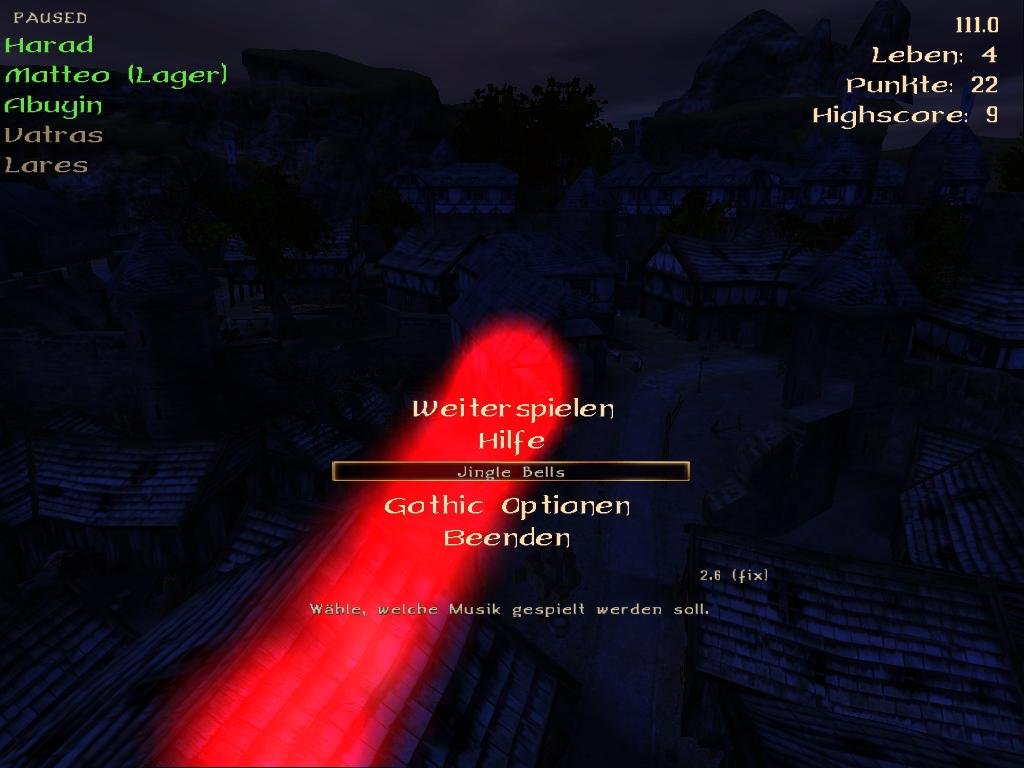 Es gibt zwei verschiedene Weihnachtslieder als Hintergrundmusik zur Auswahl. Im Hintergrund fliegt der Irrwichtel mit Turbo vorbei.